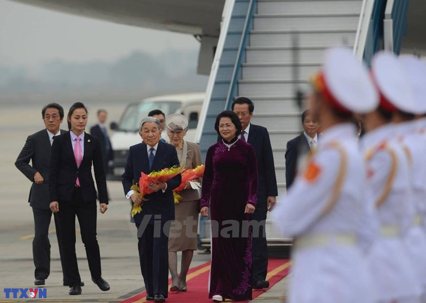 Phó Chủ tịch nước Đặng Thị Ngọc Thịnh cùng Nhà Vua và Hoàng hậu Nhật Bản ra xe. (Ảnh: PV/Vietnam+)