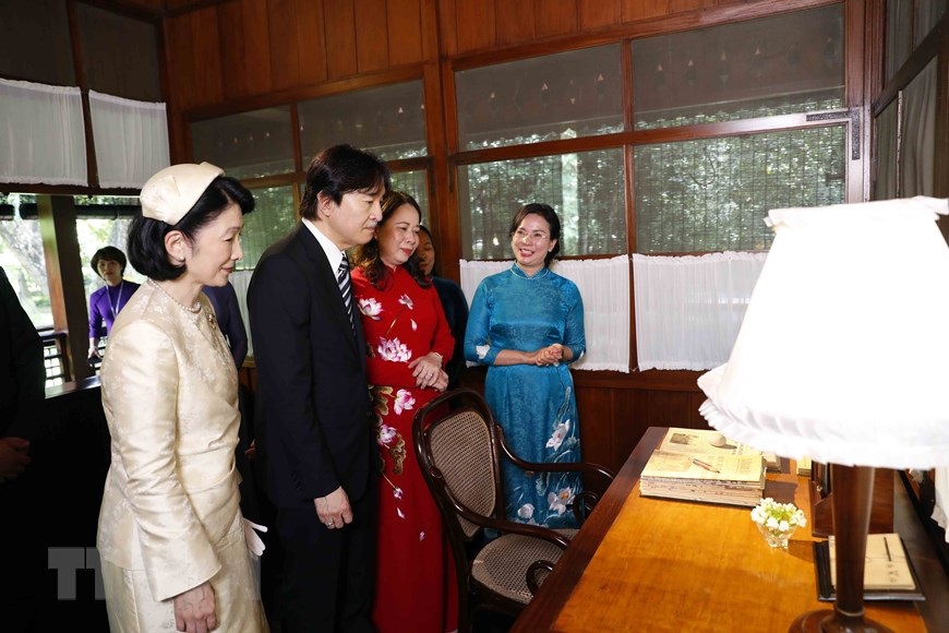 Phó Chủ tịch nước Võ Thị Ánh Xuân, Hoàng Thái tử Nhật Bản Akishino và Công nương Kiko tham quan Khu di tích Chủ tịch Hồ Chí Minh tại Phủ Chủ tịch. (Ảnh: Minh Đức/TTXVN)