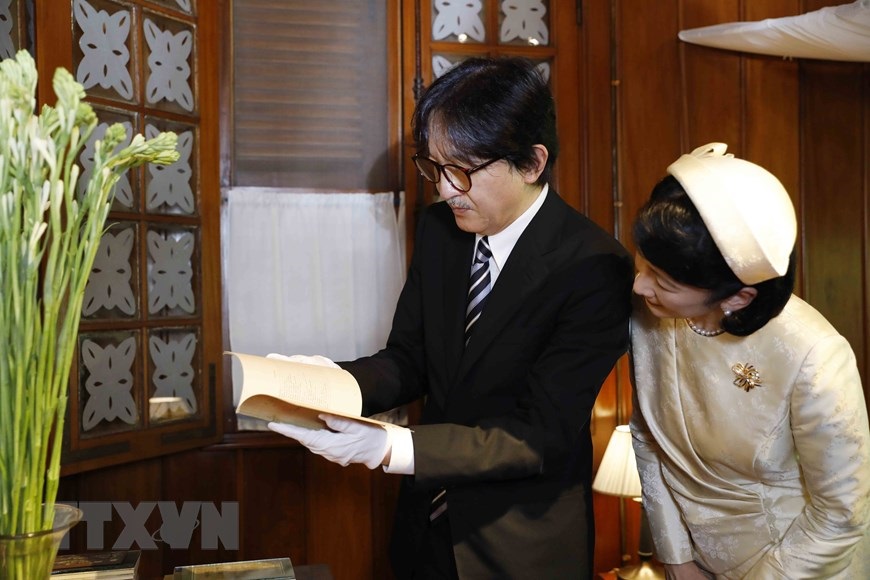 Hoàng Thái tử Nhật Bản Akishino và Công nương Kiko thể hiện sự trân trọng được chiêm ngưỡng, chạm vào những kỷ vật của Người để lại. (Ảnh: An Đăng/TTXVN)