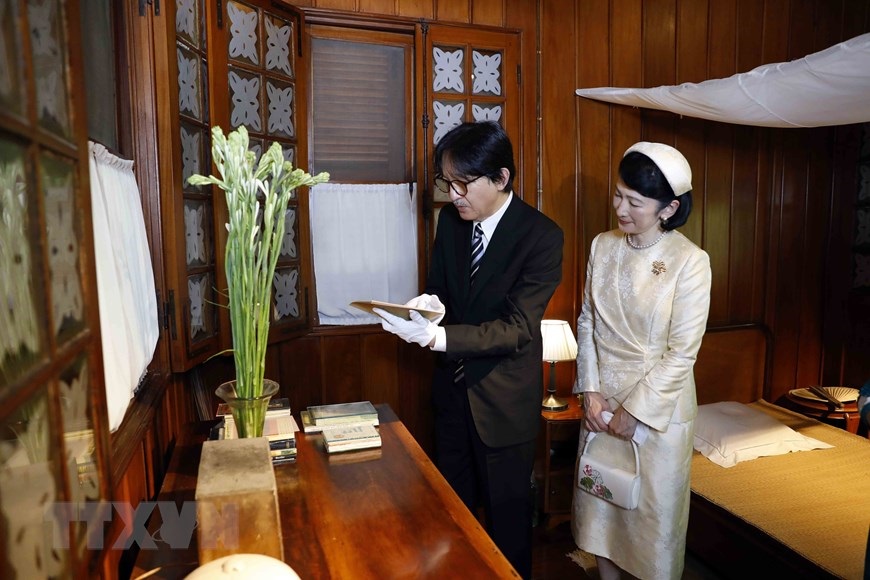 Hoàng Thái tử Nhật Bản Akishino và Công nương Kiko thăm Nhà sàn Bác Hồ và thể hiện sự trân trọng được chiêm ngưỡng, chạm vào những kỷ vật của Người để lại. (Ảnh: An Đăng/TTXVN)