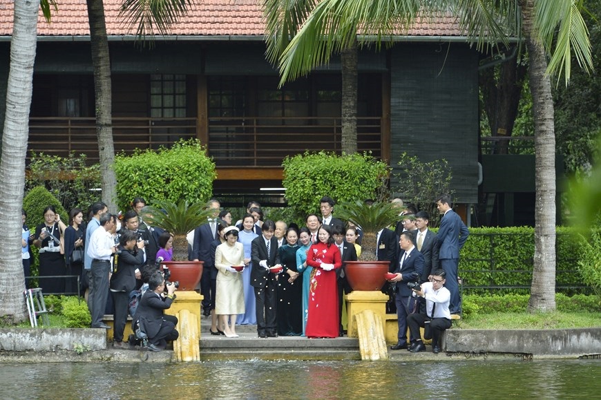 Phó Chủ tịch nước Võ Thị Ánh Xuân, Hoàng Thái tử Nhật Bản Akishino và Công nương Kiko thăm Nhà sàn Bác Hồ trong Khu di tích Chủ tịch Hồ Chí Minh tại Phủ Chủ tịch. (Ảnh: An Đăng/TTXVN)