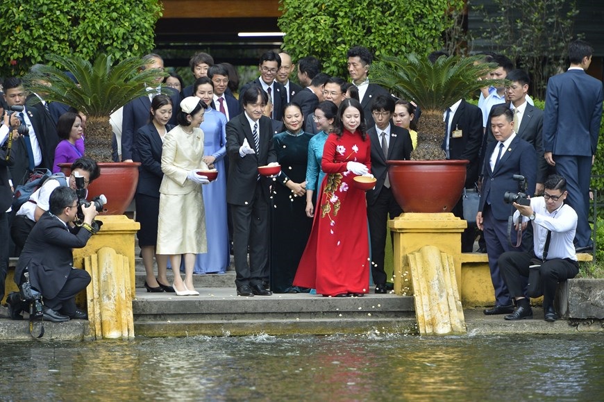 Phó Chủ tịch nước Võ Thị Ánh Xuân, Hoàng Thái tử Nhật Bản Akishino và Công nương Kiko cho cá ăn tại Ao cá Bác Hồ. (Ảnh: Minh Đức/TTXVN)