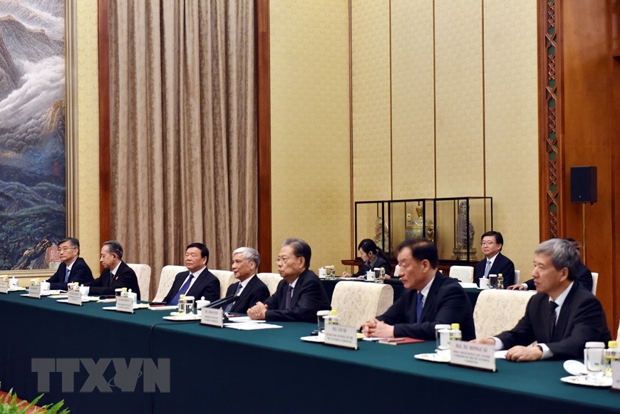 Ủy viên trưởng Nhân đại Toàn quốc Trung Quốc Triệu Lạc Tế (thứ 3, phải) và đoàn đại biểu Trung Quốc trong cuộc gặp Chủ tịch nước Võ Văn Thưởng, tại Bắc Kinh ngày 17/10. (Ảnh: Dương Trung Cường/TTXVN)