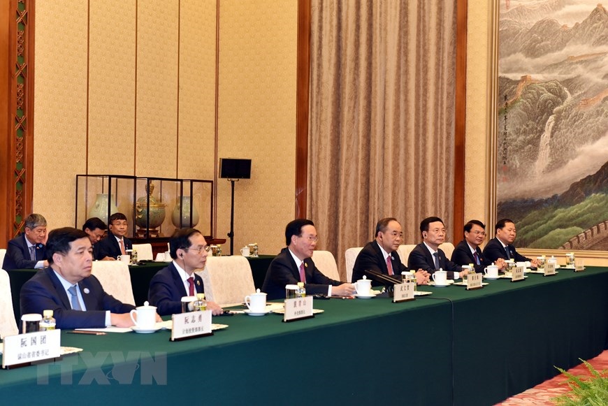 Chủ tịch nước Võ Văn Thưởng và đoàn đại biểu Việt Nam trong cuộc gặp Ủy viên trưởng Nhân đại Toàn quốc Trung Quốc Triệu Lạc Tế tại Bắc Kinh ngày 17/10. (Ảnh: Dương Trung Cường/TTXVN)
