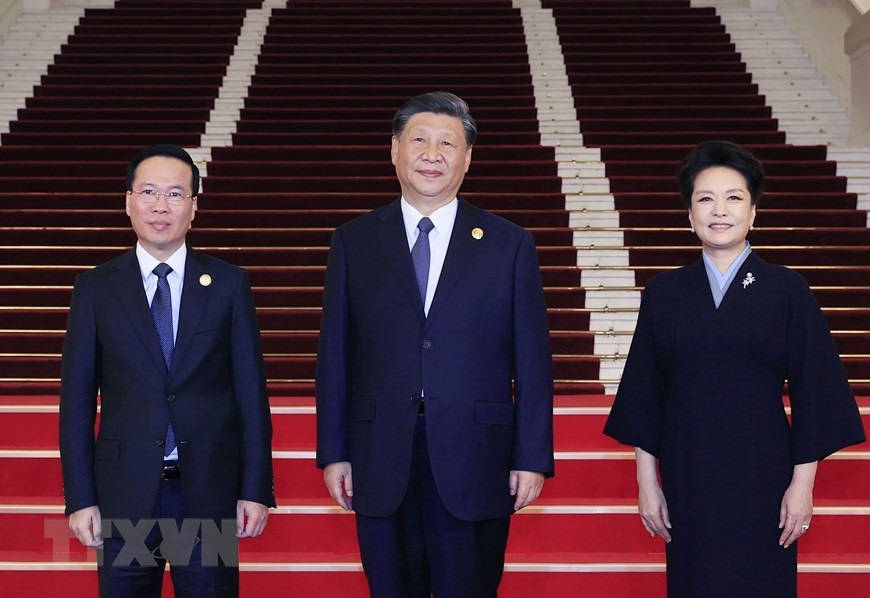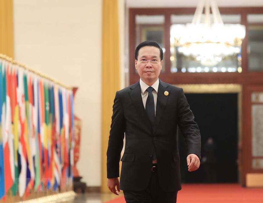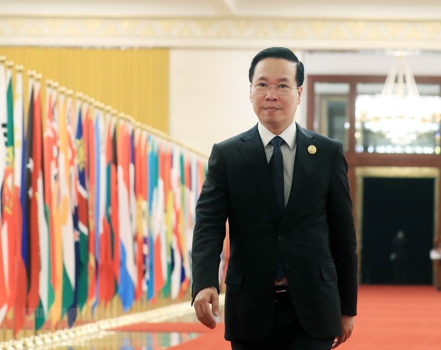 Chủ tịch nước Võ Văn Thưởng tới dự tiệc chiêu đãi chào mừng Trưởng đoàn và Phu nhân các nước dự Diễn đàn Cấp cao Hợp tác Quốc tế "Vành đai và Con đường" lần thứ ba tại Bắc Kinh, ngày 17/10. (Ảnh: Thống Nhất/TTXVN)