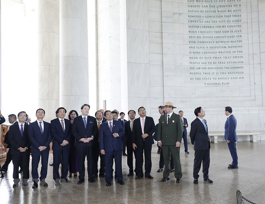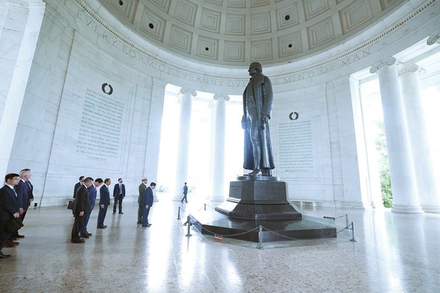 Thủ tướng Chính phủ Phạm Minh Chính tham quan công trình Đài tưởng niệm Tổng thống Thomas Jefferson. (Ảnh: Dương Giang/TTXVN)