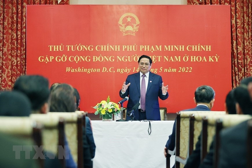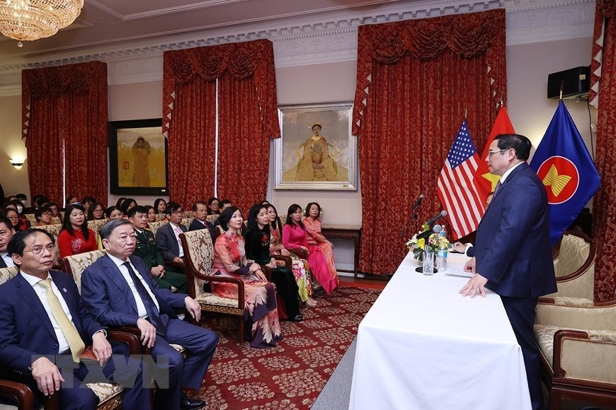 Thủ tướng Phạm Minh Chính phát biểu tại buổi gặp gỡ đại diện cộng đồng người Việt Nam tại Hoa Kỳ. (Ảnh: Dương Giang/TTXVN)