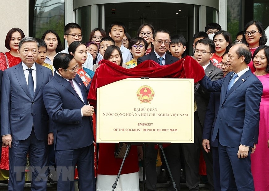 Thủ tướng Phạm Minh Chính và các đại biểu gắn biển trụ sở mới Đại Sứ quán Việt Nam tại Hoa Kỳ. (Ảnh: Dương Giang/TTXVN)
