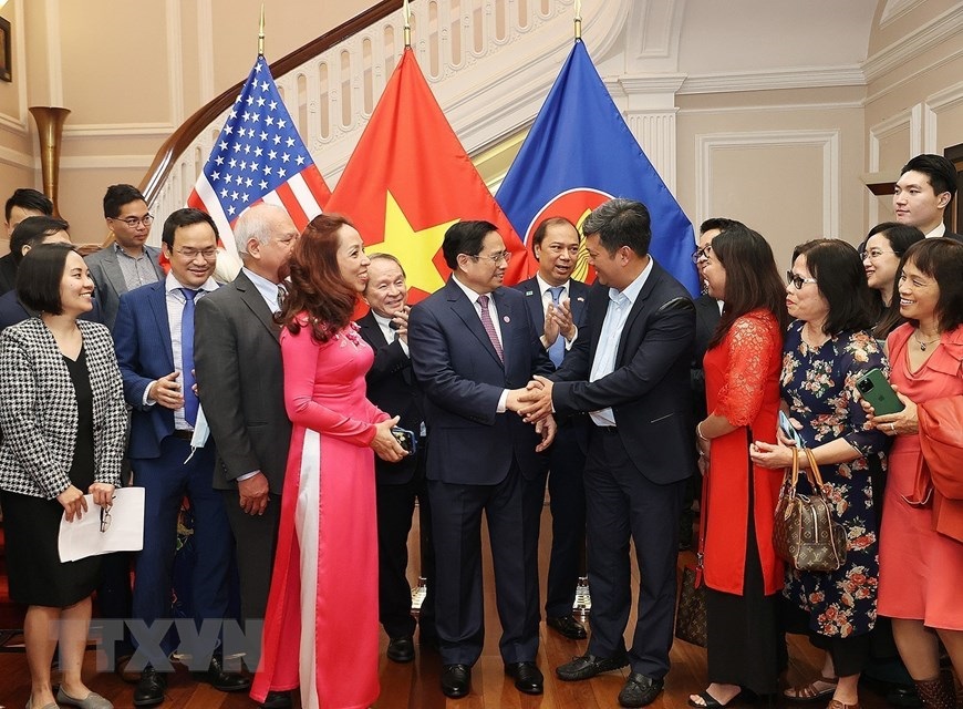 Thủ tướng Phạm Minh Chính với đại diện cộng đồng người Việt Nam tại Hoa Kỳ. (Ảnh: Dương Giang/TTXVN)
