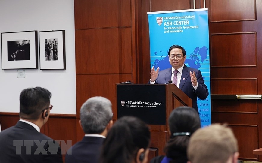 Thủ tướng Phạm Minh Chính phát biểu tại Đại học Harvard. (Ảnh: Dương Giang/TTXVN)