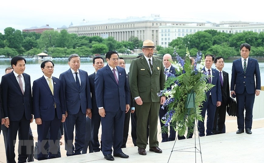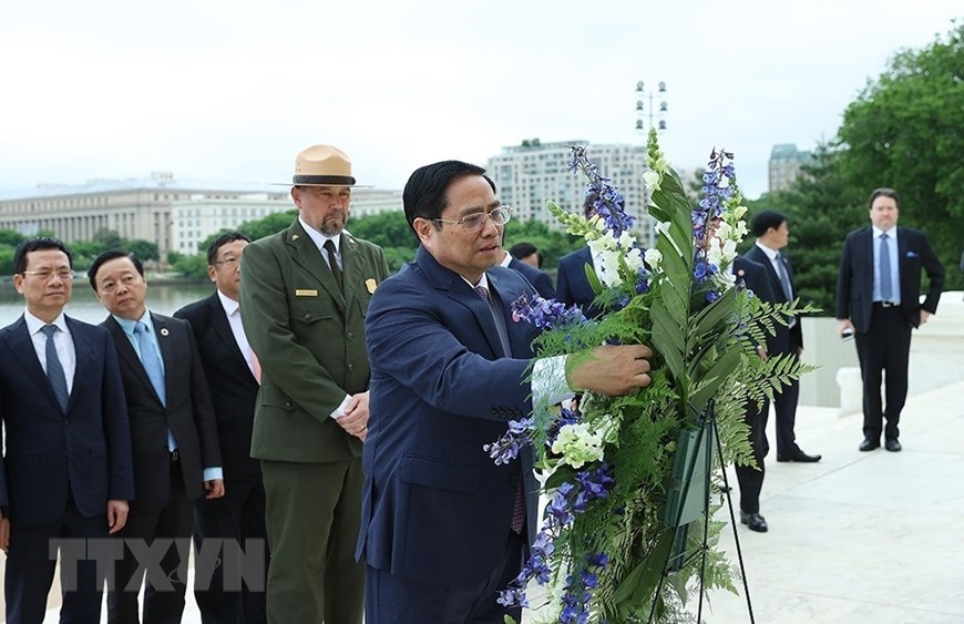 Thủ tướng Chính phủ Phạm Minh Chính đến đặt hoa tại Đài tưởng niệm Tổng thống Thomas Jefferson. (Ảnh: Dương Giang/TTXVN)