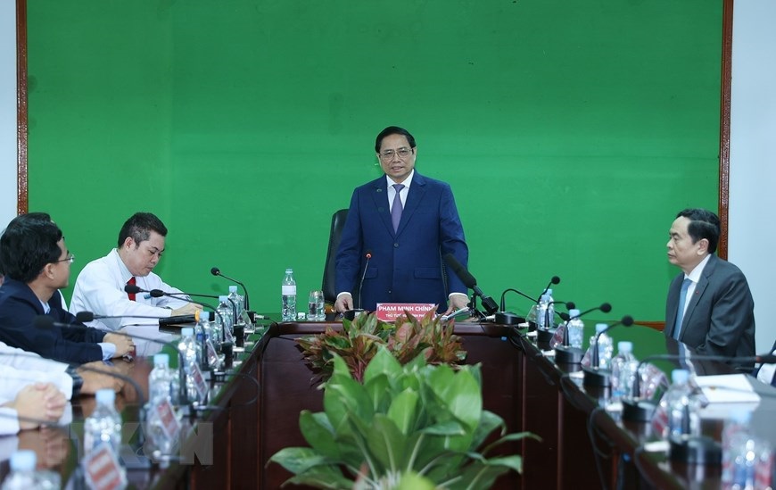 Thủ tướng Phạm Minh Chính động viên bác sĩ và nhân viên y tế Bệnh viện Chợ Rẫy - Phnom Penh. (Ảnh: Dương Giang/TTXVN)