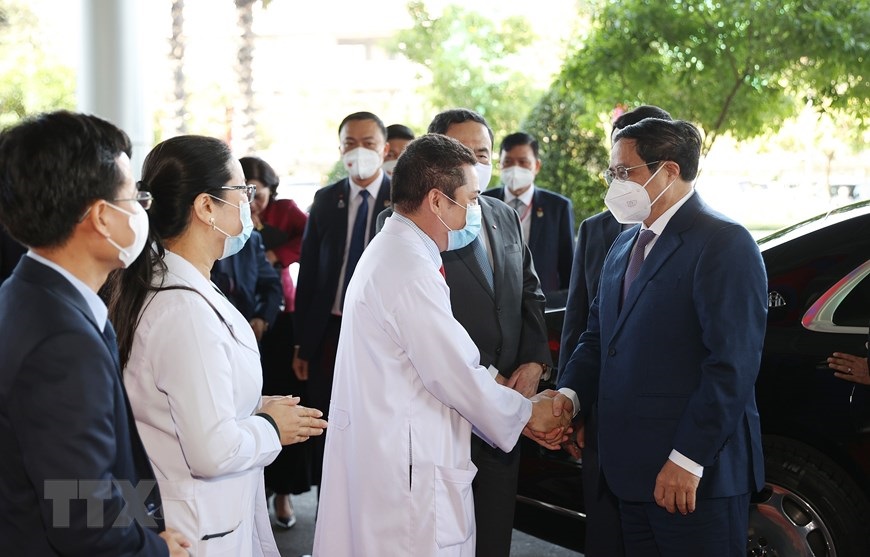 Thủ tướng Phạm Minh Chính đến thăm Bệnh viện Chợ Rẫy-Phnom Penh. (Ảnh: Dương Giang/TTXVN)