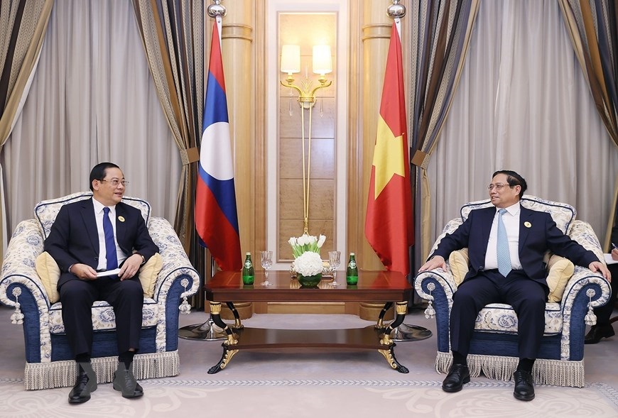 Thủ tướng Phạm Minh Chính gặp Thủ tướng Lào Sonexay Siphandone. (Ảnh: Dương Giang/TTXVN)