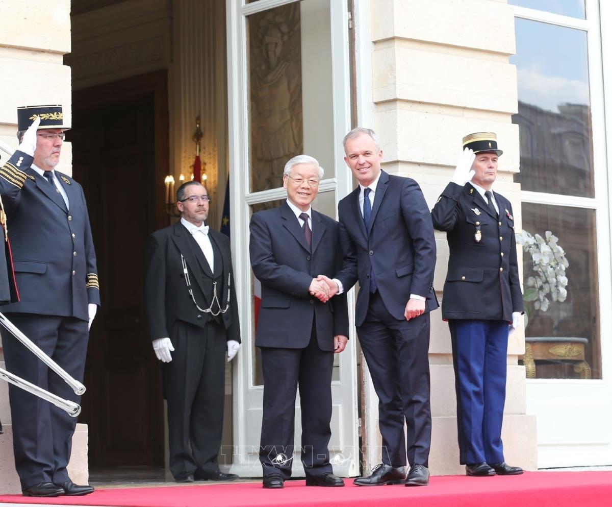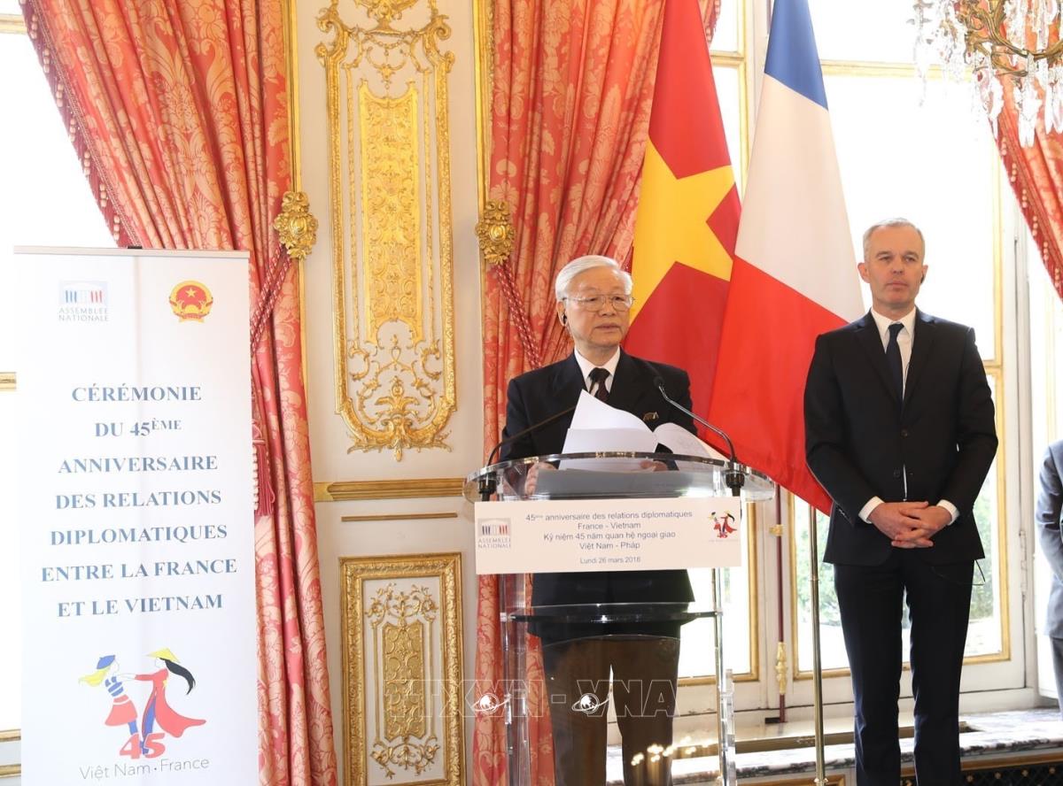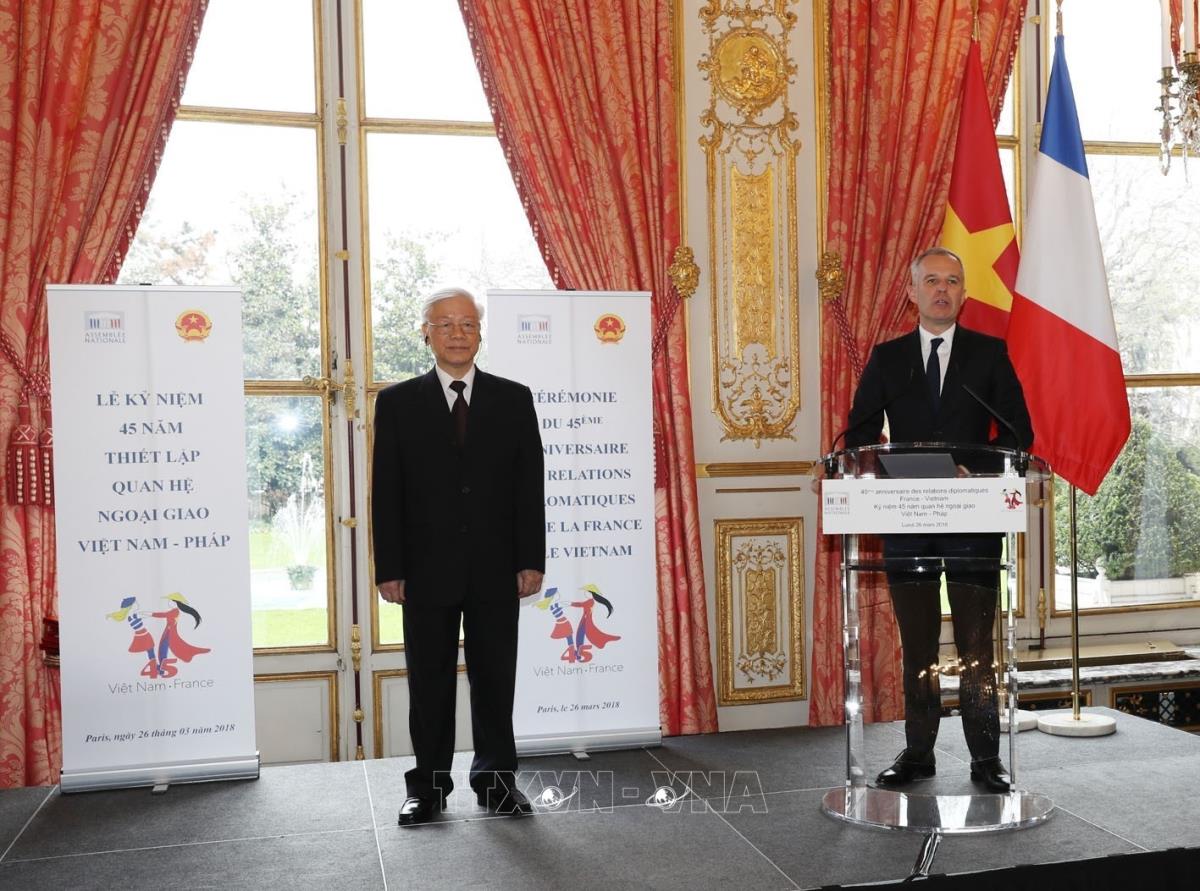 Tổng Bí thư Nguyễn Phú Trọng cùng Chủ tịch Quốc hội Pháp Francois de Rugy dự Lễ kỷ niệm 45 năm thiết lập quan hệ ngoại giao Việt Nam-Pháp (1973-2018) (26/3/2018). Ảnh : Trí Dũng – TTXVN.