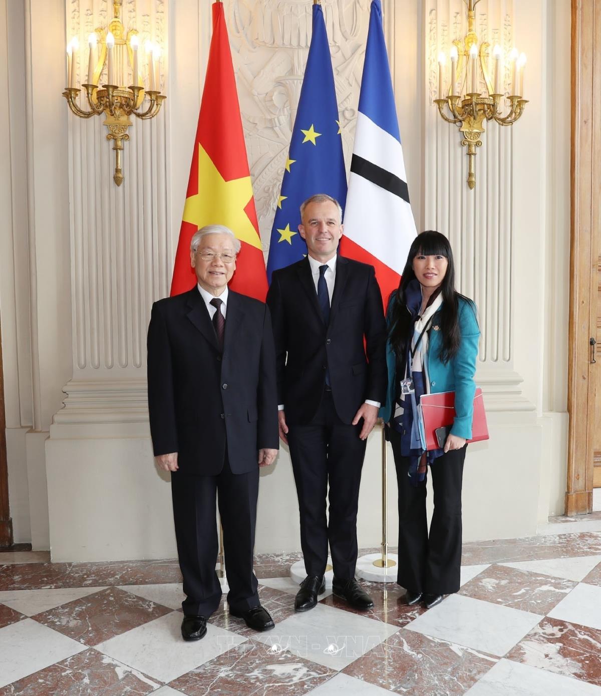 Tổng Bí thư Nguyễn Phú Trọng và Chủ tịch Quốc hội Pháp Francois de Rugy cùng Chủ tịch Nhóm hữu nghị Pháp- Việt tại Quốc hội Pháp Stéfanie Đỗ (26/3/2018). Ảnh : Trí Dũng – TTXVN.
