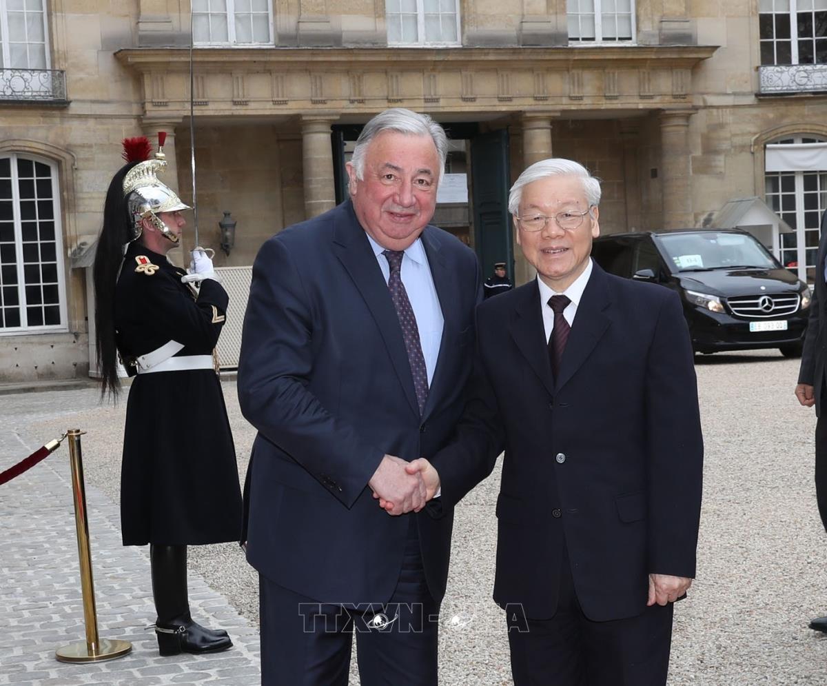 Chủ tịch Thượng viện Pháp Gérard Larcher đón Tổng Bí thư Nguyễn Phú Trọng (26/3/2018).Ảnh : Trí Dũng – TTXVN.