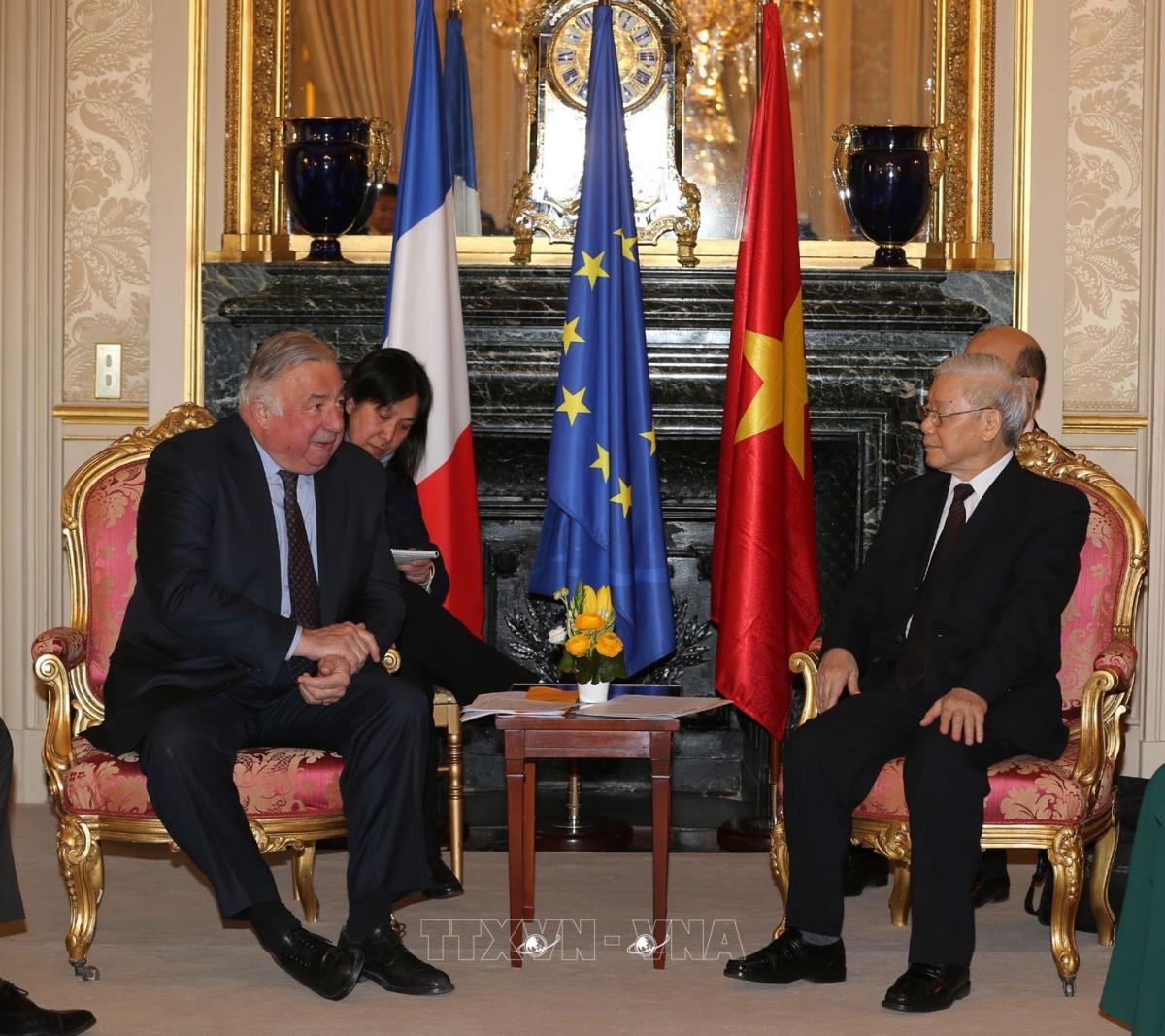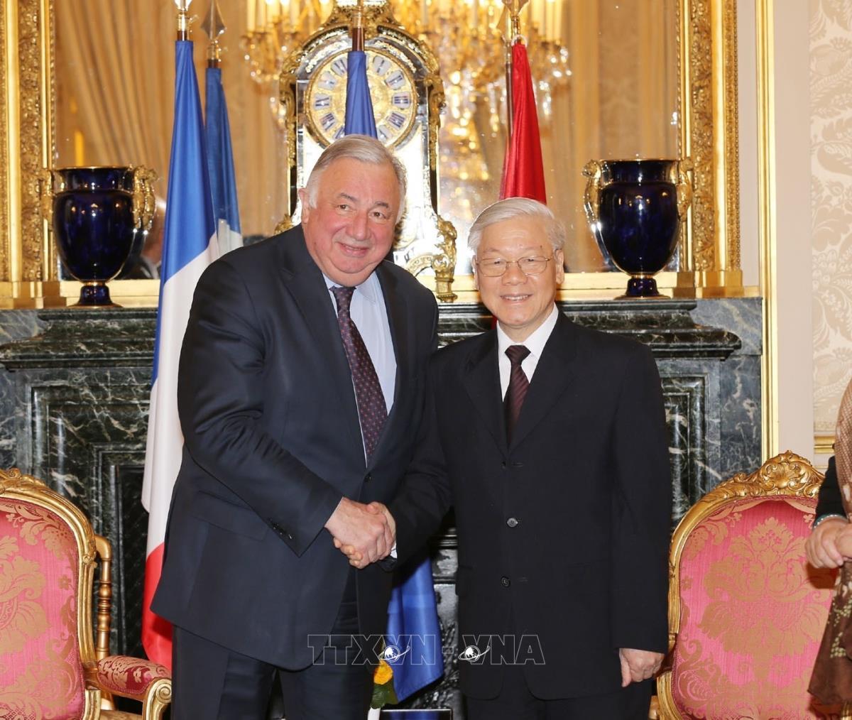 Tổng Bí thư Nguyễn Phú Trọng hội kiến với Chủ tịch Thượng viện Pháp Gérard Larcher (26/3/2018). Ảnh : Trí Dũng – TTXVN.