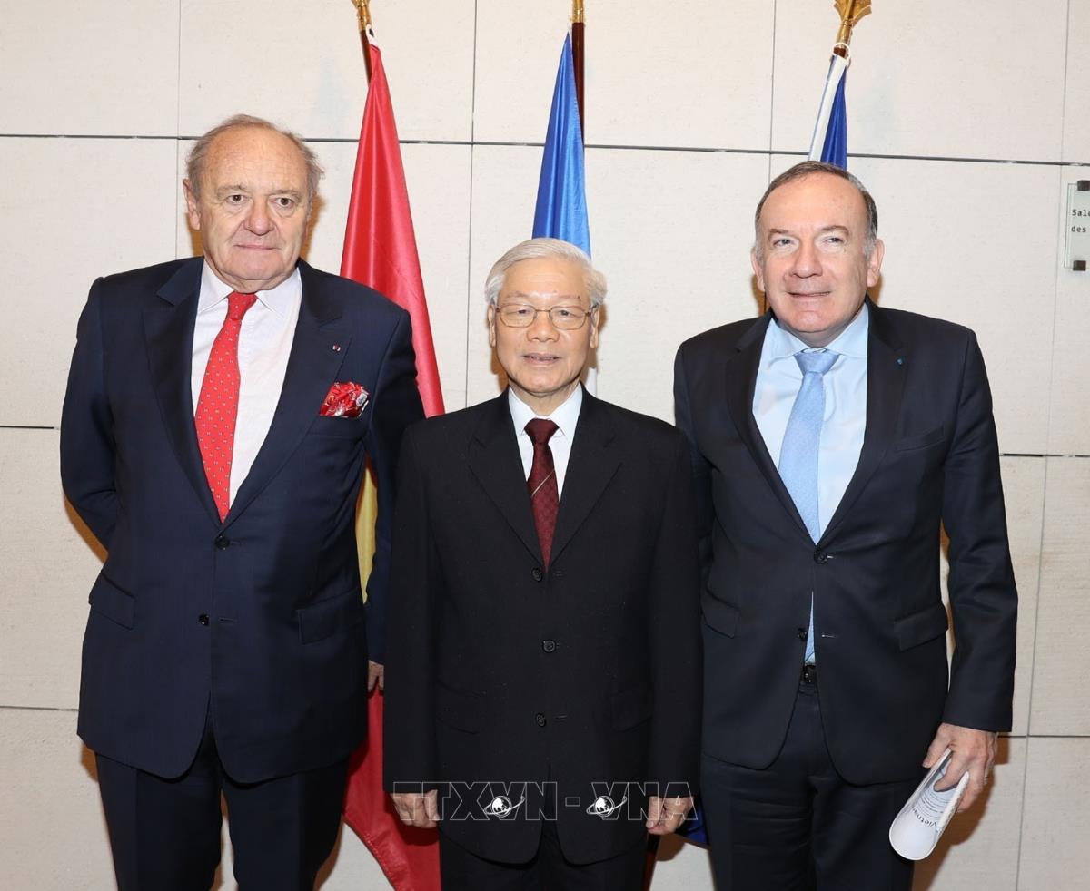 Chủ tịch MEDEF Pierre Gattaz và Phó Chủ tịch MEDEF đón Tổng Bí thư Nguyễn Phú Trọng (27/3/2018). Ảnh: Trí Dũng - TTXVN