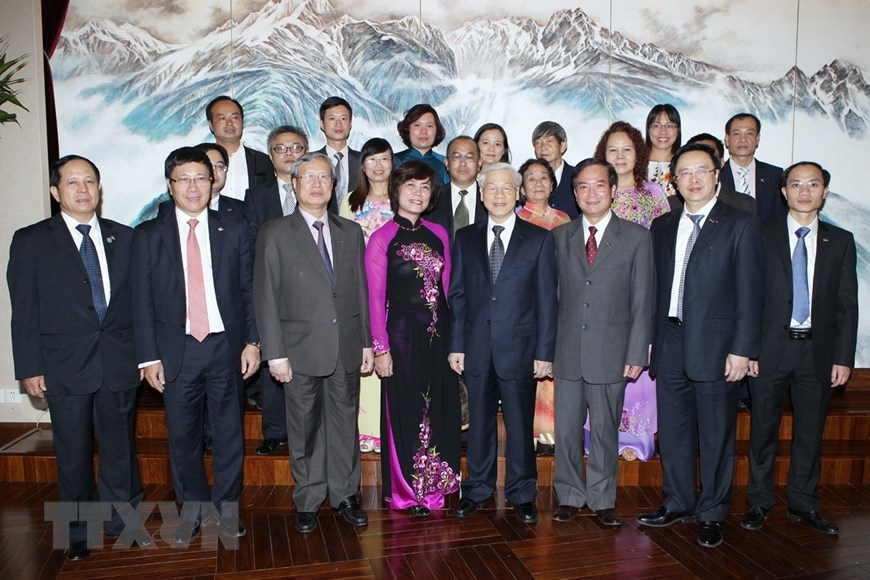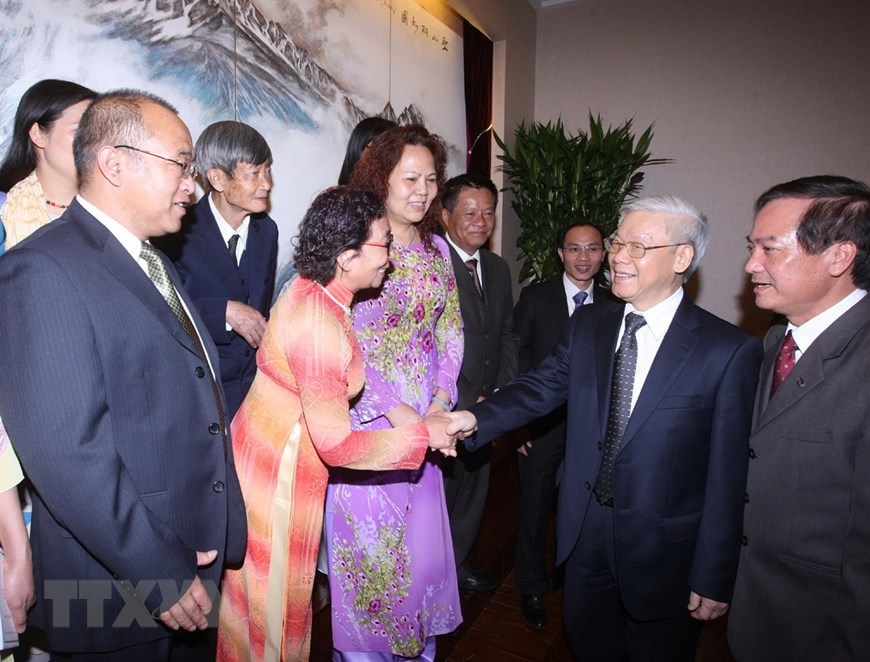 Tổng Bí thư Nguyễn Phú Trọng nói chuyện với cán bộ Tổng lãnh sự quán và đại diện Việt kiều. (Ảnh: Trí Dũng/TTXVN)