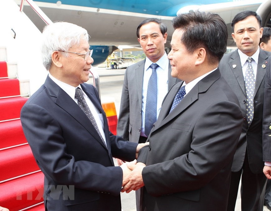Đồng chí Lý Kỳ Hằng, Ủy viên Trung ương Đảng, Bí thư Tỉnh ủy Vân Nam đón Tổng Bí thư Nguyễn Phú Trọng tại Sân bay Quốc tế Trường Thuỷ, thành phố Côn Minh. (Ảnh: Trí Dũng/TTXVN)