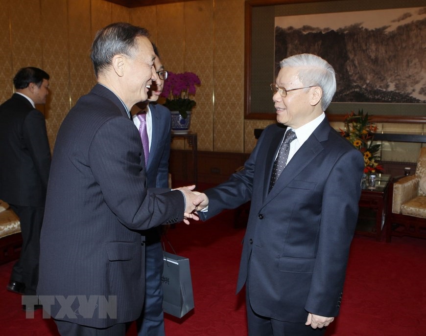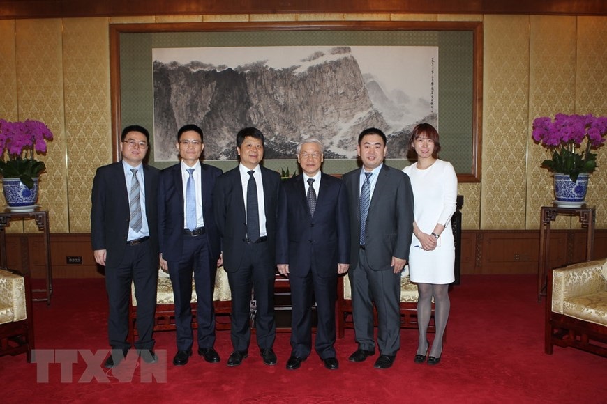 Tổng Bí thư Nguyễn Phú Trọng tiếp lãnh đạo Tập đoàn Trung Hưng đến chào. (Ảnh: Trí Dũng/TTXVN)