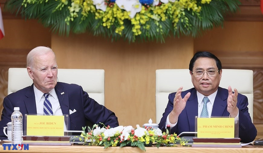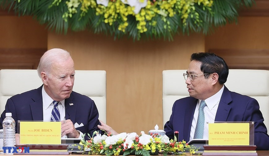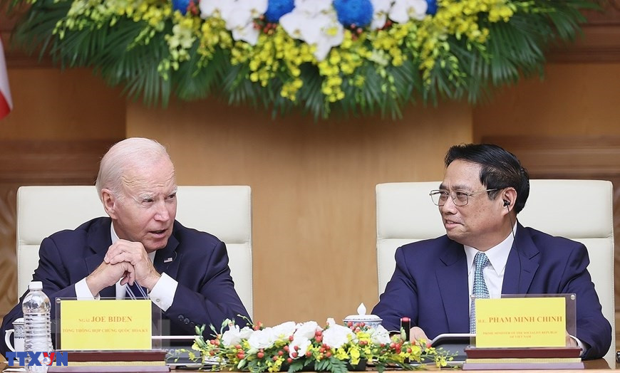 Thủ tướng Phạm Minh Chính và Tổng thống Joe Biden tại Hội nghị Cấp cao Việt Nam-Hoa Kỳ về Đổi mới Sáng tạo và Đầu tư. (Ảnh: Dương Giang/TTXVN)