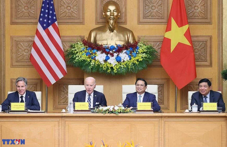 Thủ tướng Phạm Minh Chính và Tổng thống Hoa Kỳ Joe Biden dự Hội nghị Cấp cao Việt Nam-Hoa Kỳ về Đổi mới Sáng tạo và Đầu tư. (Ảnh: Dương Giang/TTXVN)