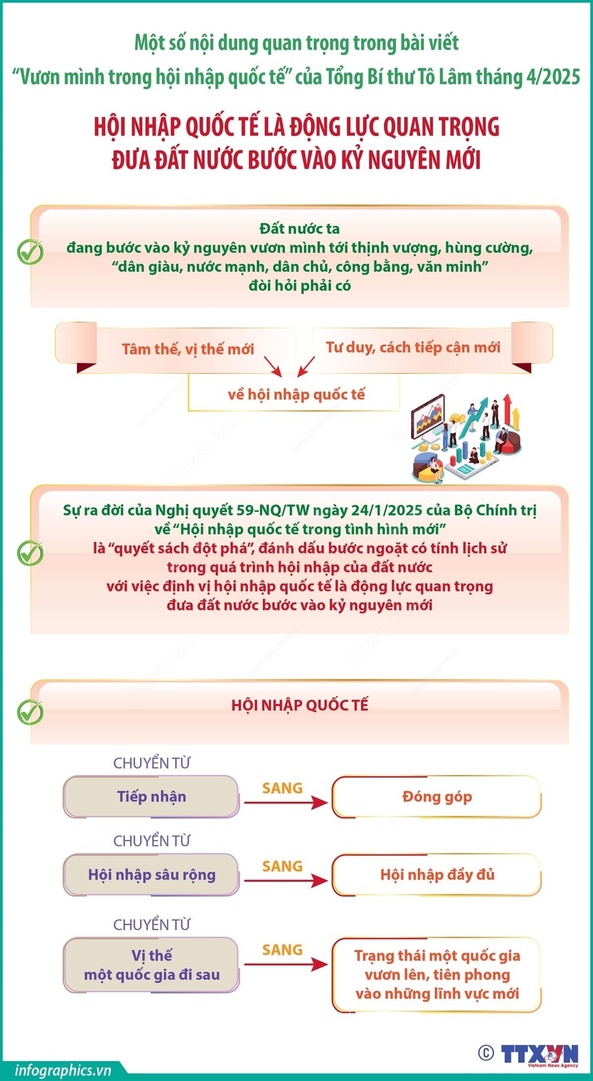 Trong bài viết “Vươn mình trong hội nhập quốc tế” ngày 3/4/2025, Tổng Bí thư Tô Lâm khẳng định: Đất nước ta đang bước vào kỷ nguyên vươn mình tới thịnh vượng, hùng cường, “dân giàu, nước mạnh, dân chủ, công bằng, văn minh” đòi hỏi phải có tâm thế, vị thế mới và tư duy, cách tiếp cận mới về hội nhập quốc tế.