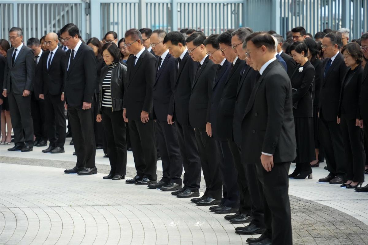 Trưởng Khu hành chính đặc biệt Hong Kong (Trung Quốc) Lý Gia Siêu cùng các quan chức tại lễ tưởng niệm các nạn nhân vụ cháy chung cư ở khu phức hợp Wang Fuk Court thuộc quận Tai Po, ngày 29/11/2025. Ảnh: THX/TTXVN