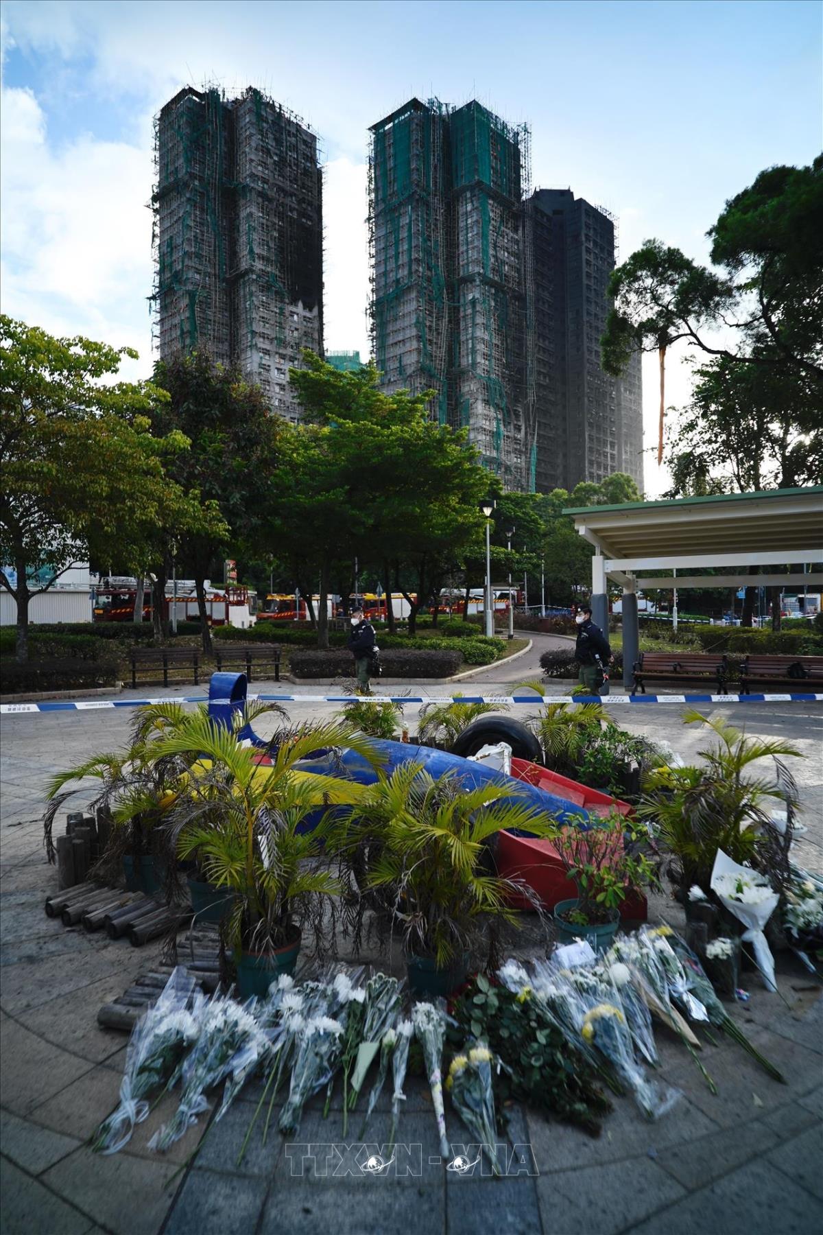 Đặt hoa tưởng niệm các nạn nhân tại khu tổ hợp Wang Fuk Court ở Tai Po, Hong Kong (Trung Quốc), ngày 29/11/2025. Ảnh: THX/TTXVN