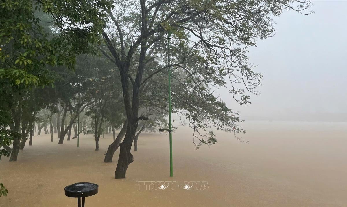 Nước sông Hương dâng cao, Nghinh Lương Đình (phường Phú Xuân) chìm trong nước lũ (3/11/2025). Ảnh: Văn Dũng-TTXVN