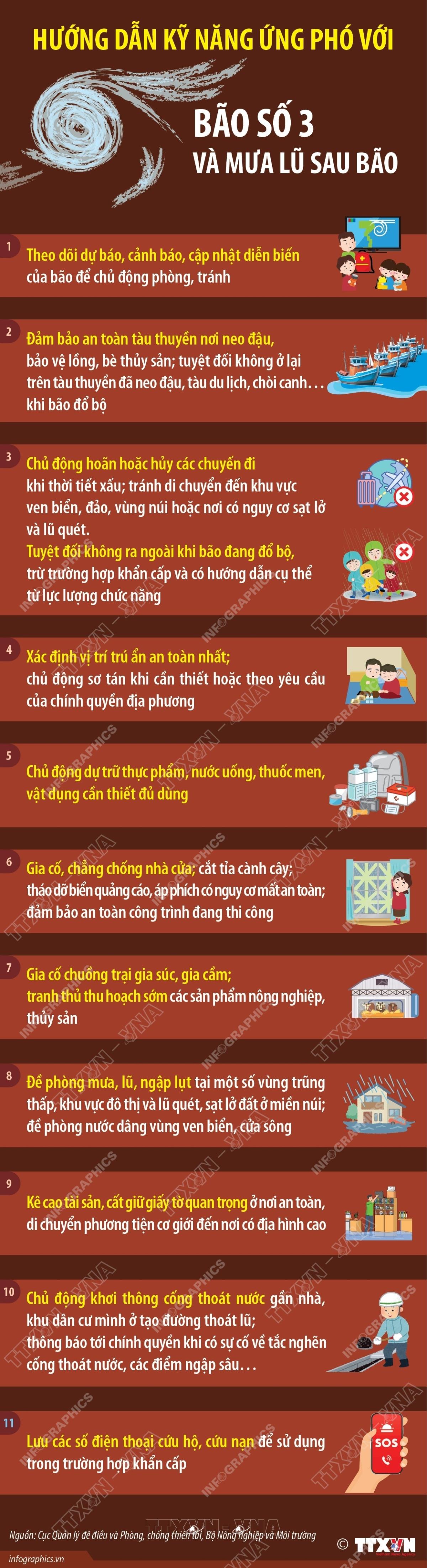 Hà Nội (TTXVN 21/7/2025) Theo Cục Quản lý đê điều và Phòng, chống thiên tai, mưa lớn do bão số 3 có khả năng gây ra tình trạng ngập úng tại các vùng trũng, thấp; lũ quét trên các sông, suối nhỏ, sạt lở đất trên sườn dốc. Để đảm bảo an toàn tính mạng và tài sản trước bão và mưa lũ sau bão, người dân lưu ý không nên chủ quan, tuân thủ theo các khuyến cáo sau.