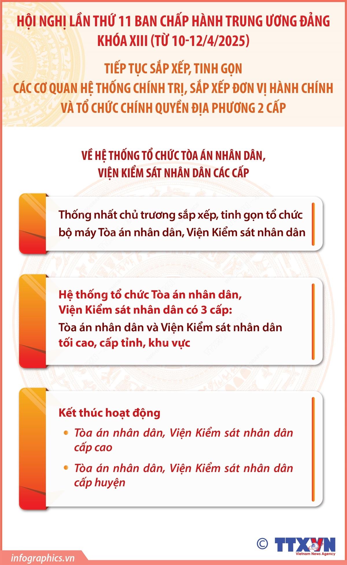 Tại Hội nghị lần thứ 11, Ban Chấp hành Trung ương thống nhất chủ trương sắp xếp, tinh gọn tổ chức bộ máy Tòa án nhân dân, Viện Kiểm sát nhân dân; hệ thống tổ chức Tòa án nhân dân, Viện Kiểm sát nhân dân có 3 cấp: Tòa án nhân dân và Viện Kiểm sát nhân dân tối cao, cấp tỉnh, khu vực. Kết thúc hoạt động của Tòa án nhân dân, Viện Kiểm sát nhân dân cấp cao và Tòa án nhân dân, Viện Kiểm sát nhân dân cấp huyện.