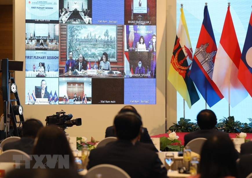 Sáng 8/9, tại Trung tâm Hội nghị Quốc tế ở Thủ đô Hà Nội, Đại hội đồng Liên nghị viện Hiệp hội các quốc gia Đông Nam Á lần thứ 41 (AIPA-41) khai mạc với chủ đề Ngoại giao Nghị viện vì Cộng đồng ASEAN gắn kết và chủ động thích ứng lần đầu tiên được tổ chức theo hình thức trực tuyến. (Ảnh: Văn Điệp/TTXVN)