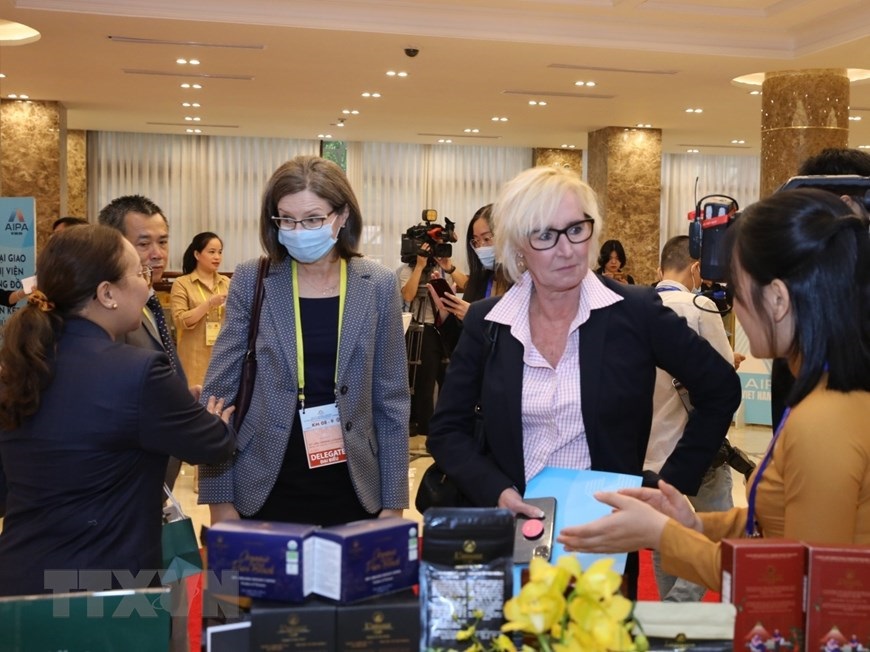 Các đại biểu quốc tế tham quan các gian hàng bên lề lễ khai mạc. (Ảnh: Văn Điệp/TTXVN)