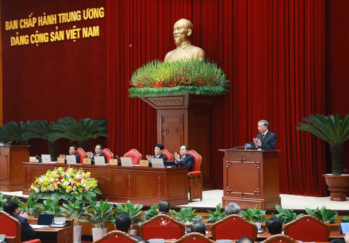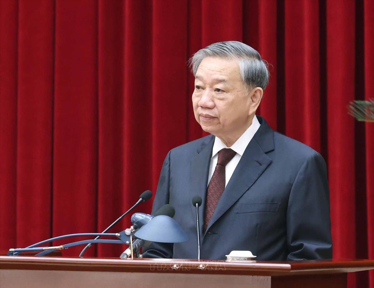 Tổng Bí thư Tô Lâm phát biểu khai mạc Hội nghị lần thứ 11 Ban Chấp hành Trung ương Đảng khóa XIII (10/4/2025). Ảnh: TTXVN