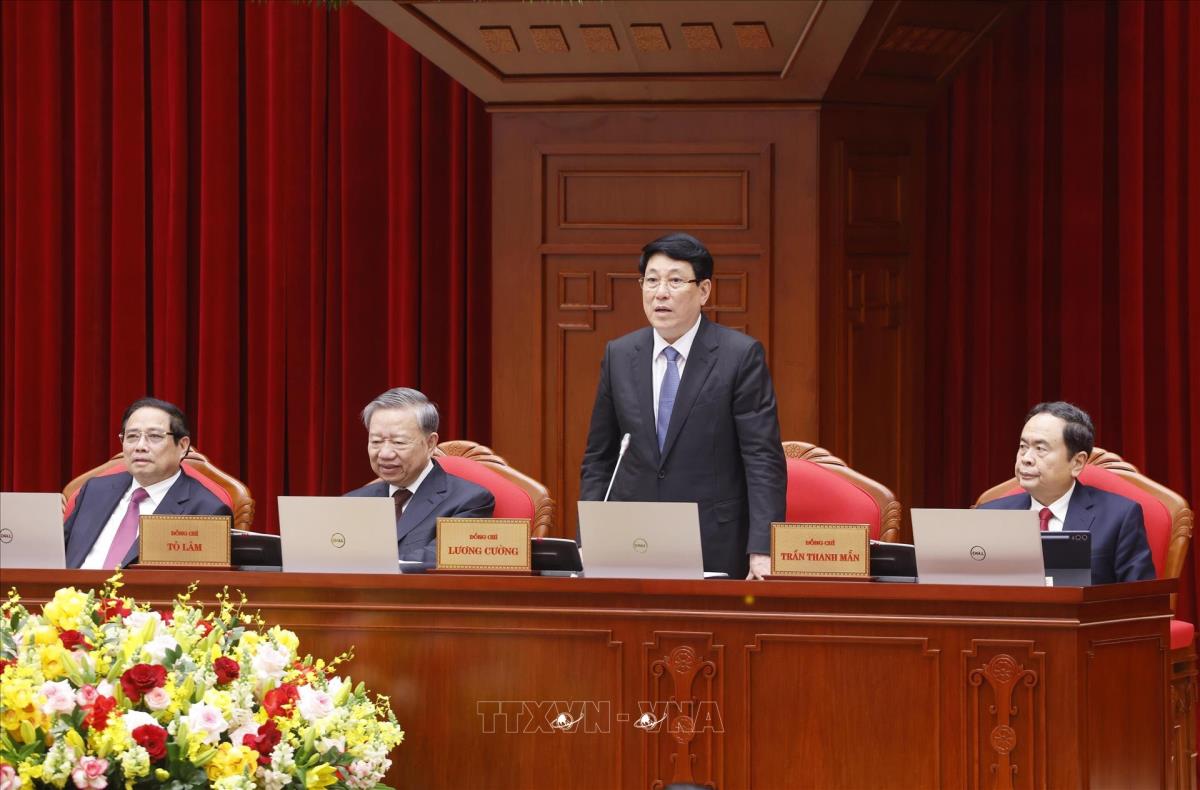 Uỷ viên Bộ Chính trị, Chủ tịch nước Lương Cường điều hành Phiên khai mạc Hội nghị lần thứ 11 Ban Chấp hành Trung ương Đảng khóa XIII (10/4/2025). Ảnh: TTXVN