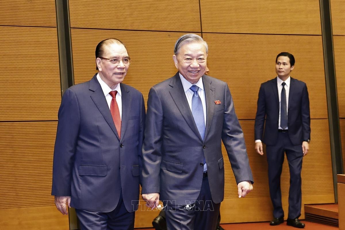 Tổng Bí thư Tô Lâm và nguyên Tổng Bí thư Nông Đức Mạnh đến dự phiên khai mạc (20/10/2025). Ảnh: Doãn Tấn - TTXVN