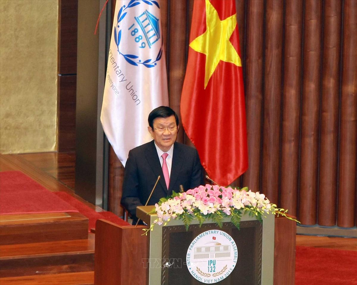 Trong bài phát biểu chào mừng, Chủ tịch nước Trương Tấn Sang nhấn mạnh, Việt Nam rất vinh dự lần đầu tiên sau 36 năm gia nhập Liên minh Nghị viện Thế giới, được tín nhiệm đăng cai Đại hội đồng IPU-132 tại Hà Nội. Đây không chỉ là hoạt động đối ngoại đa phương rất có ý nghĩa được tổ chức tại Việt Nam, mà còn là một trong những sự kiện lớn của năm 2015 - năm có nhiều hoạt động kỷ niệm quan trọng, đánh dấu những chặng đường lịch sử của dân tộc Việt Nam trong công cuộc xây dựng và bảo vệ Tổ quốc.