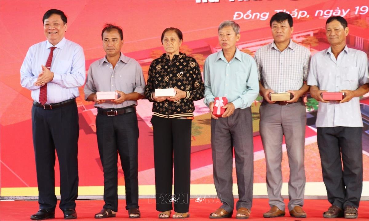 Ông Phạm Thành Ngại (bìa trái), Phó Bí thư Tỉnh ủy, Chủ tịch Ủy ban nhân tỉnh Đồng Tháp tặng quà cho các hộ dân ảnh hưởng bởi dự án đã nhiệt tình ủng hộ (19/3/2026). Ảnh: Hữu Chí - TTXVN