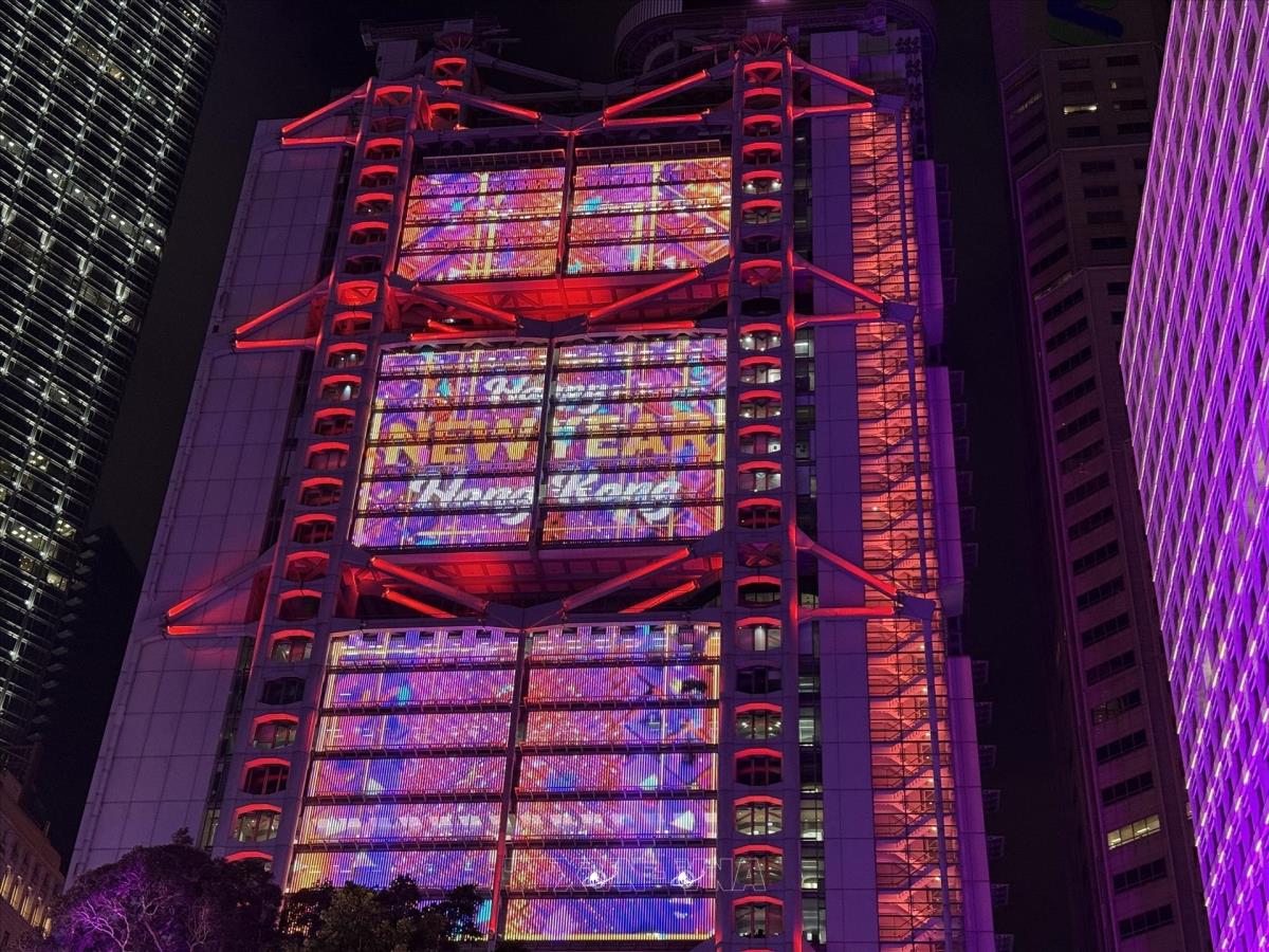 Hình ảnh dòng chữ Năm mới được chiếu trên các tòa nhà ở khu vực Central.Ảnh: Mạc Luyện - PV TTXVN tại Hong Kong