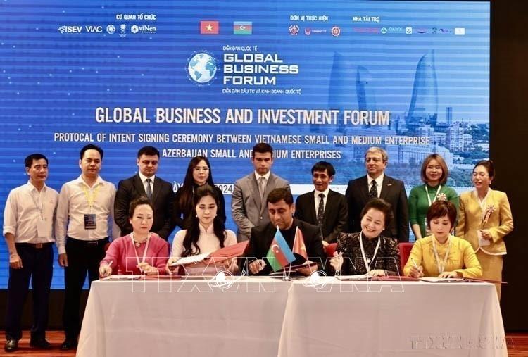 Ký kết biên bản hợp tác giữa doanh nghiệp Việt Nam và Azerbaijan tại Diễn đàn Đầu tư và Kinh doanh toàn cầu 2024 do Hiệp hội Khởi nghiệp Quốc gia phối hợp với Đại sứ quán Azerbaijan tại Việt Nam tổ chức. Ảnh: Trần Việt - TTXVN
