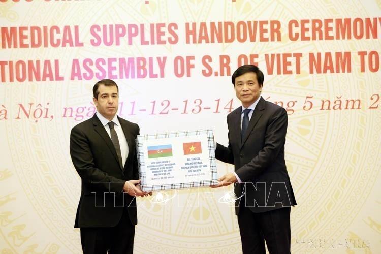 Tổng Thư ký, Chủ nhiệm Văn phòng Quốc hội Nguyễn Hạnh Phúc trao tượng trưng vật tư y tế cho Đại sứ Cộng hòa Azerbaijan tại Việt Nam Anar Imanov. Đây là quà tặng của Quốc hội Việt Nam tặng Nghị viện một số nước trong phòng, chống dịch bệnh COVID-19 (Hà Nội, 14/5/2020) Ảnh: Dương Giang - TTXVN