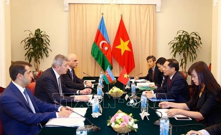 Thứ trưởng Thường trực Bộ Ngoại giao Bùi Thanh Sơn và Thứ trưởng Bộ Ngoại giao Azerbaijan Ramiz Ayvaz oglu Hasanov chủ trì Tham vấn chính trị nhằm trao đổi về tình hình quan hệ song phương, cũng như một số vấn đề quốc tế và khu vực cùng quan tâm (Hà Nội, 12/3/2019). Ảnh: Văn Điệp – TTXVN