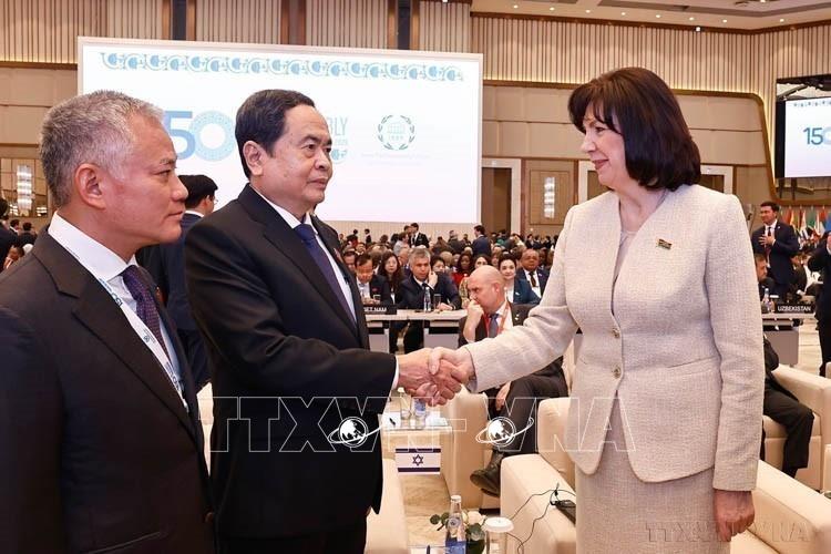 Bên lề Phiên thảo luận chung Đại hội đồng lần thứ 150 của Liên minh Nghị viện thế giới (IPU-150), tổ chức tại Thủ đô Tashkent (Uzbekistan), sáng 7/4/2025, Chủ tịch Quốc hội Trần Thanh Mẫn gặp Chủ tịch Quốc hội Azerbaijan Shahiba Gafarova. Ảnh: Doãn Tấn-TTXVN