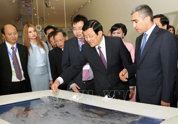 Chủ tịch nước Trương Tấn Sang tham quan Bảo tàng cố Tổng thống Azerbaijan Heydar Aliyev ở thủ đô Baku, ngày 15/5/2015. Ảnh: Nguyễn Khang – TTXVN