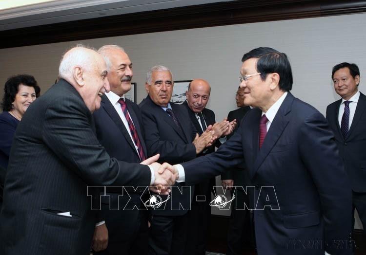 Chủ tịch nước Trương Tấn Sang gặp mặt thân mật các cựu chiến binh, giáo sư, chuyên gia Azerbaijan đã từng giúp đào tạo kỹ sư dầu khí của Việt Nam (Baku, 14/5/2015). Ảnh: Nguyễn Khang – TTXVN