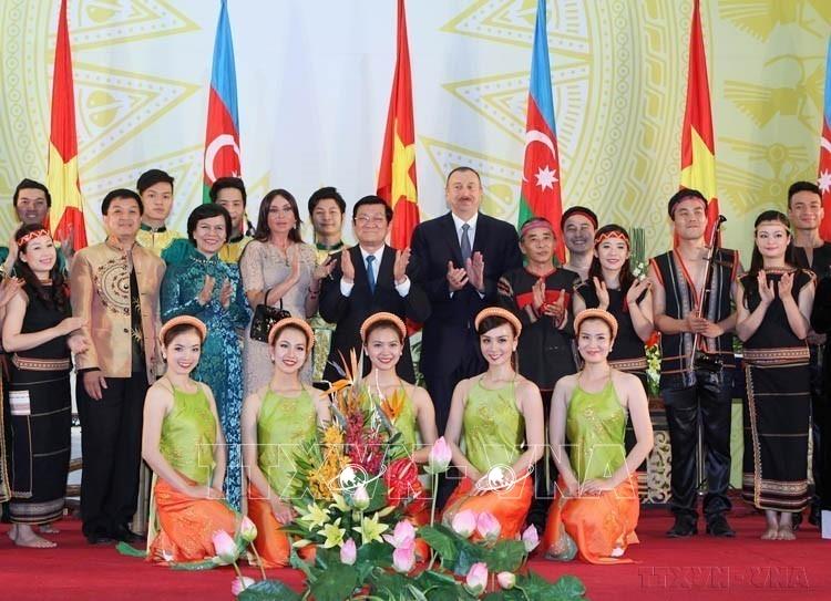Chủ tịch nước Trương Tấn Sang và Phu nhân cùng Tổng thống Cộng hòa Azerbaijan Ilham Aliyev và Phu nhân với các nghệ sĩ Việt Nam (Hà Nội, 19/5/2014). Ảnh: Dương Giang - TTXVN
