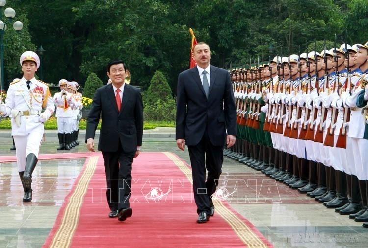 Chủ tịch nước Trương Tấn Sang chủ trì lễ đón Tổng thống Cộng hòa Azerbaijan Ilham Aliyev và Phu nhân thăm cấp Nhà nước tới Việt Nam (Hà Nội, 19/5/2014). Ảnh: Nguyễn Khang - TTXVN